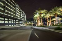 A nighttime view of an empty road in the city of Los Angeles. The road stretches straight ahead, lined with palm trees and tall buildings. The modern architecture and artificial light give the scene a vibrant and urban feel.