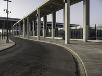 A captivating stock photo featuring an empty road leading to a large open area with lots of columns and benches nearby. The asphalt road stretches ahead, surrounded by the tranquil ambiance of the early morning. The city's skyline emerges in the background, casting shadows and providing a stunning backdrop. The road, bridge, and metropolitan area façade harmoniously blend to create a picturesque scene. This photo perfectly captures the essence of a peaceful morning in a vibrant and bustling city.