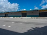 An empty road in Miami, Florida, next to an industrial building with a loading dock. The hard shadows created by the bright Florida sun contrast with the clear blue skies. A typical day in Miami Beach.