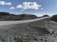 the empty road leading up to a mountain is surrounded by rocks and mountains under a blue sky