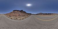 an empty road stretches into the sky near a mountain range and the sun shines on the horizon