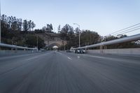 A car drives down an empty road near a large archway. The straight road stretches into the distance, with motion blur creating a sense of speed. The architecture of the archway stands tall against the clear sky. Street lights and poles line the thoroughfare, illuminating the asphalt road surface. This infrastructure connects different locations, symbolizing the connectivity and progress of modern transportation. The break of day adds a serene and peaceful atmosphere to the scene.