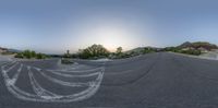 a fisheye lens view of an empty road with trees and grass in the background