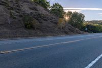 This stock photo features an empty road with a few signs and trees near by on a hillside, illuminated by the setting sun. The asphalt road stretches out into the distance, lined with green grass and woody plants. The rolling landscape creates a picturesque scene with tints and shades, enhanced by the sunlight and clouds in the sky. The hard shadows cast by the trees and hill add depth and contrast to the image. This captivating rural scenery captures the peacefulness and beauty of nature at dusk.