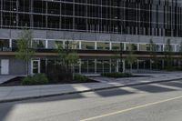 This stock photo features an empty road in Toronto, Canada, surrounded by tall city buildings. The road surface is made of asphalt, and there are no people in sight. The cityscape showcases the urban design and architectural facades of the office buildings. The presence of vegetation, such as trees, adds a touch of greenery to the otherwise industrial and warehouse-filled area. The photo was taken during the day, capturing the bustling atmosphere of the city.