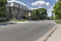 This stock photo features an empty road located in a residential area in Toronto, Canada. The street is surrounded by buildings and trees in the background. The urban setting, with its classic architecture and urban design, creates a beautiful cityscape. The photograph captures the tranquility of a day in the neighborhood, with clouds dotting the sky above. The asphalt lane stretches into the distance, giving a sense of depth and perspective to the image.