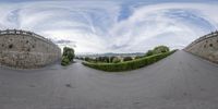 a fish eye lens of an empty road in italy on the left, a bridge in the right
