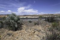 an empty road next to two shrubs near a desert plain in the united states on a sunny day