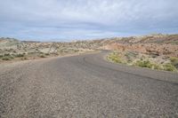 Barren and rugged landscape of Utah's San Rafael Swell. A gloomy, grey sky hangs over the empty road cutting through the brown desert. The straight road leads to the horizon, offering a glimpse of the magnificent red rock canyonlands.