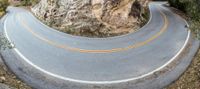 An empty road winding up a mountain, surrounded by picturesque natural landscape. The high rural road follows the curve of a rock wall with switchbacks. A top-down view captures the elevated beauty.