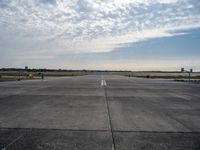 an empty runway with a single airplane sitting out in the distance under a partly cloudy sky