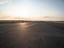 An empty runway on the side of a road in Berlin at sunset. The clear sky and bright blue horizon create a serene atmosphere. The urban landscape blends with the natural environment, showcasing the city's unique urban design.