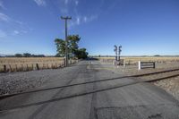 An empty rural road stretching into the distance, surrounded by fields and trees. The road surface and railroad tracks indicate agricultural and transportation infrastructure. Clear skies and open space create a serene landscape.