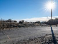 This stock photo showcases a view of an empty rural street in Mulholland, Los Angeles, California, USA. The road is made of asphalt and extends across the open field. A single red fire hydrant can be seen nearby, adding a pop of color to the landscape. It is a sunny day with clear blue skies and the sun is visible, casting a warm glow on the surroundings. The mountains in the distance and the dirt path add to the natural beauty of the scene.