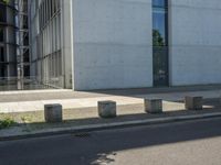 A photo of an empty sidewalk next to a tall building on a city street in Berlin, Germany. The road is made of asphalt and concrete, showcasing the modern architecture of the building. The neighborhood is a residential area with houses and properties. It is a sunny day with trees lining the facade of the building. The woody plants create a natural element against the urban design. The infrastructure and road surface are well-maintained, reflecting the real estate value of the area. Shadows cast on the sidewalk enhance the metropolitan atmosphere. This public space in Berlin represents the urban lifestyle of Europe and the structural elements of the city.