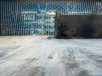 This stock photo features the view of an empty sidewalk in front of a tall building with blue glass on its side. The modern architecture building, located in Shenzhen, China, showcases its sleek design and futuristic features. The cityscape of Shenzhen, known for its urban development and modern infrastructure, can be seen in the background. The clear sky and the low profile of the building create a sense of openness and spaciousness. The walkway and the grassy area surrounding the building add to the overall aesthetic appeal. This image is perfect for illustrating urban landscapes, modern architecture, and the vibrant city of Shenzhen.