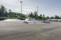 This stock photo showcases an empty skate park located in Toronto, Ontario, Canada. The skate park features a low concrete road surface surrounded by grassy open spaces and trees. It is a perfect location for recreational activities and various sports. The clear sky with scattered clouds and contrails adds to the serene ambiance of this park. The skate park is waiting for people to come and enjoy the sport of skating on its smooth asphalt surface. The surrounding vegetation and stadium in the background provide a beautiful backdrop for this recreational area. The image also captures a parking lot nearby, providing easy access to visitors. Capture the essence of leisure and adventure with this stunning stock image.