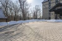 the driveway is empty and snowed near some brickwork and trees with a church in the distance