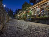 This stock photo features an empty stone street in an old Chinese city at night. The photo showcases red lanterns hanging along the street, with green trees in the background. It captures the historic architecture and urban design of the city, with its low residential buildings and classic architecture. The dim lighting from artificial lights creates a magical atmosphere. This image is perfect for illustrating city life, tourism, and the unique charm of old towns in China. It is also relevant for topics such as urban planning, urban design, and suburban areas. The photo was taken in Yunnan province, specifically in the ancient village of Lijiang, which is known for its cultural significance and tourist attractions.