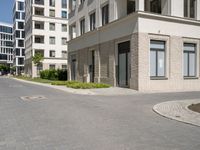 An empty street in Berlin, lined with modern residential buildings. The clear sky adds to the aesthetic of urban design. Cobblestone road surface adds a touch of history to the city. A perfect day to explore Berlin's architecture.