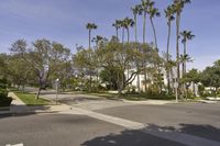 empty street with palm trees on either side of the road with residential buildings in the background
