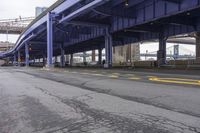 This stock photo showcases an empty street with traffic and blue supports, located near the iconic Brooklyn Bridge in the bustling city of New York. The road is made of modern composite material and the area is shaded by the bridge beams. The metropolitan setting features graffiti walls, reflecting the vibrant urban design of Manhattan. It captures the essence of city life in this transport hub, highlighting the blend of classic and modern architecture in the urban landscape.