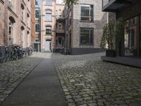 This stock photo features an empty street in Cologne, Germany. The photo showcases two buildings with a classic architecture style. Bicycles can be seen parked near the buildings. The street is paved with cobblestones, adding to the charm of the city. This image captures the urban atmosphere of Cologne, especially in the art district. It is a perfect representation of the residential area and infrastructure of this vibrant town.