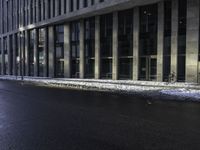 This captivating stock photo showcases an empty street covered in a glistening layer of ice. The image captures the night-time ambiance around an impressive office building. The road surface is beautifully adorned with the rectangle-shaped facade of the urban design. The tints and shades of the frozen landscape create a mesmerizing symmetry with the architecture of the office building. This dynamic composition portrays a surreal moment in the heart of the city, highlighting the composite material used in the building's construction.
