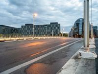 This stock photo depicts an empty street at dusk, illuminated by a streetlight. Tall buildings can be seen in the background, creating a modern cityscape. The street is located near a park, adding a touch of nature to the urban setting. The dramatic sky adds an atmosphere of drama and beauty to the scene. This image captures the essence of city life and the architectural beauty of Berlin, Germany, making it perfect for projects related to urban design, architecture, and business districts.