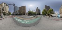 A fisheye lens captures the view of an empty street in the heart of Salt Lake City, Utah. Modern architecture and office buildings create a dynamic urban landscape. Clear skies and hard shadows enhance the city's profile.