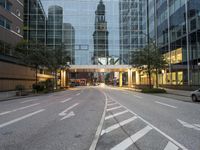 An empty street in Hamburg, Germany, surrounded by modern office buildings. The straight road leads to the business district, with a towering structure in the distance. A metropolitan area at dawn.