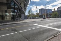 This stock photo showcases an empty street at an intersection in Ottawa, Canada. The street is surrounded by large buildings with glass windows, giving it a futuristic and modern architecture vibe. The road surface is made of smooth asphalt, providing a sleek and urban design. The clear sky above adds a touch of beauty to this city scene. The photo captures the essence of city life in Ottawa, with its business district and office buildings. The image also features trees and vegetation, adding a natural element to the urban setting. The glass walls of the buildings reflect the surrounding environment, creating an interesting visual effect.