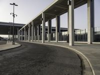 This stock photo showcases an empty street in a bustling metropolitan area during the dawn hours. The cityscape is framed by composite material facades of tall buildings, with a wide asphalt road surface leading towards a bridge in the distance. The image captures the tranquility of the moment, with street lights casting a soft glow and shades creating a serene ambience in this public space. The tarred thoroughfare is lined with parking spaces, and one can be seen adjacent to a massive building. The composition and tints and shades used in this photograph create a visually appealing cityscape view.