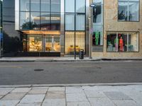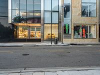 an empty street with store fronts along side a sidewalk that is partly shaded in by glass
