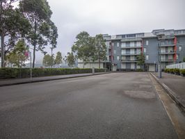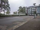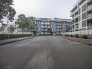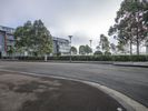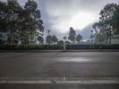 Gloomy day in the suburban business district. Empty street lined with office buildings and residential areas. Grey sky casts a gloomy shadow on the asphalt road. Straight down the road, a stop sign stands as a silent sentinel.
