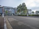 this view shows an empty street with buildings on either side and a stop sign in the middle