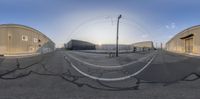 A 360-angle photo of two empty street spaces in Salt Lake City, Utah. Clear skies and low shadows create a sunny atmosphere. Industrial warehouses and manufacturing facilities line the road in the distance.