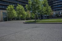 This stock photo shows an empty street in Toronto, Ontario, Canada, with some trees growing along the roadside. There is a building to the right of the street. The image captures the urban environment of the city, showcasing modern architecture and office buildings. The road surface is made of asphalt, providing a smooth pathway. The trees provide shade and add to the overall vegetation in the area. The picture is taken during the day, highlighting the bustling business district of Toronto.