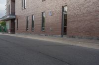 This stock photo depicts an empty street in the urban art district of Toronto, Canada at dawn. In the foreground, there is an apartment building with tall windows and brickwork. On one side of the street, there is a red fire hydrant and an open door. The road surface is made of asphalt and the curb is visible. The city skyline can be seen in the background, with clouds overhead. The image captures the urban design and beauty of Toronto, Ontario, Canada.
