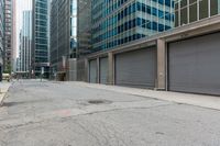 This photo captures an empty street in Toronto, Canada. The image shows a view from the outside of buildings, with no people present. The asphalt road, parking lot, and high-rise buildings contribute to the urban atmosphere. The residential and commercial buildings feature windows, walls, and glass facades. The road surface and curbs can be seen, reflecting the city's well-maintained infrastructure. This image is ideal for illustrating city life, urban design, real estate, or office buildings in Toronto.