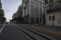 Empty tram tracks cutting through the urban landscape of San Francisco at dawn. The modern architecture and clear sky create a stunning cityscape. A glimpse of city life in motion blur.