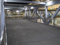 Empty walkway in a suburban parking deck in Los Angeles. The artificial lights reflect off the metal beams and windows, creating a dark and mysterious atmosphere. A tranquil night scene in the heart of the city.