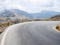 An empty winding road in the mountains of Spain, with a bike rider standing on it. The road curves through the mountain pass, offering a breathtaking view of the mountain range. The Balearic Islands provide a stunning backdrop to this scenic landscape.