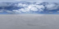 Expansive salt flat desert with endless horizons under a clear blue sky. Sunlight accentuates the vast open space, offering a serene and sunny day with sparse clouds across the sky.