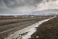 An endless road stretches through the snowy highlands of Australia. The white snow line contrasts with the dark clouds in the dramatic winter sky. Rocks and snow create a picturesque landscape.