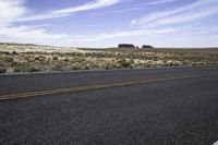 a highway going through an empty desert area with bushes and rocks in the distance and a lone building sits on the horizon