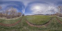 a field with grass and tracks in the middle and a mountain in the distance with clouds