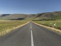 This is an image of an endless road in Iceland, surrounded by lush green grass and vegetation. The road cuts through the beautiful landscape of the highlands, with mountains in the distance. The clear sky highlights the vastness of the scene, giving a sense of endlessness to the road. The road surface is made of asphalt and leads to the horizon, creating a straight path into the distance. This photo captures the rural and natural beauty of Iceland, showcasing the endless roads that can be found on the island.