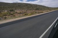 a person riding a motorcycle on a long highway in the desert, with a mountain backdrop