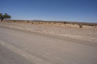 A stunning landscape in South Africa, featuring an endless road that stretches into the horizon. Beige-colored dirt and gravel road surface blends with the surrounding desert. Clear sky with tints and shades of blue. Nature and vegetation add a touch of life to the barren plain.